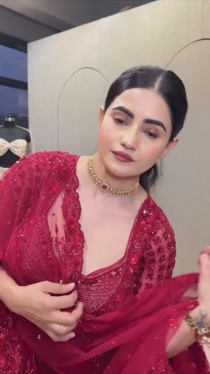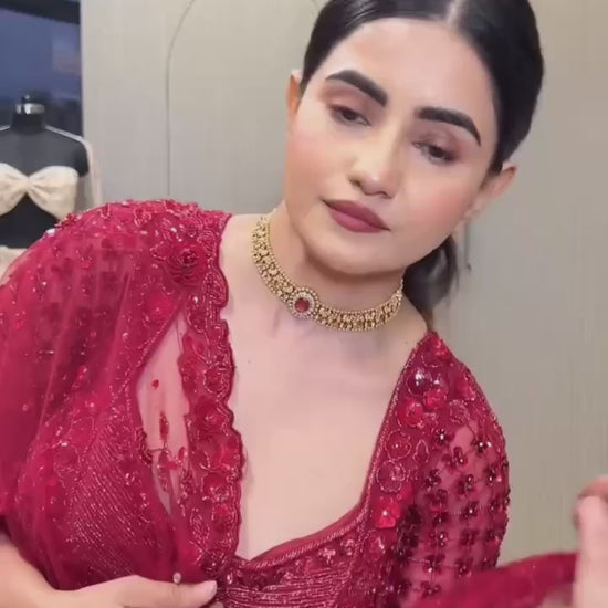Maroon Net Hand-Embroidered Lehenga Choli with Sequins, Dori & Pearl Work | Bridal & Party Wear